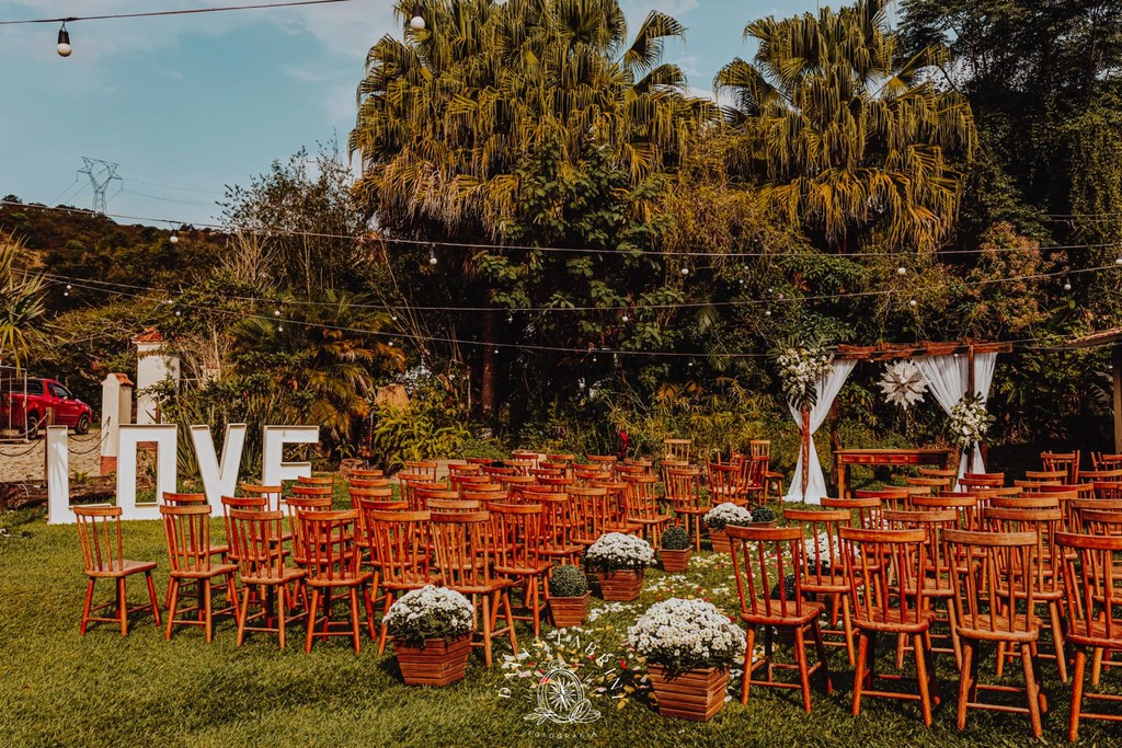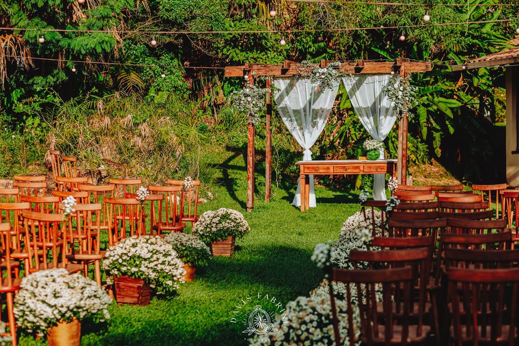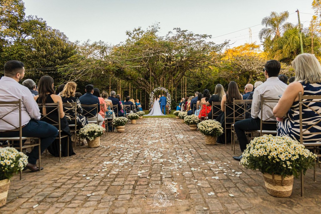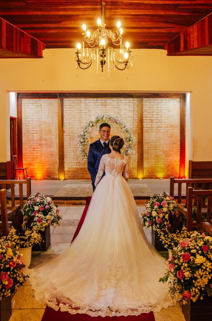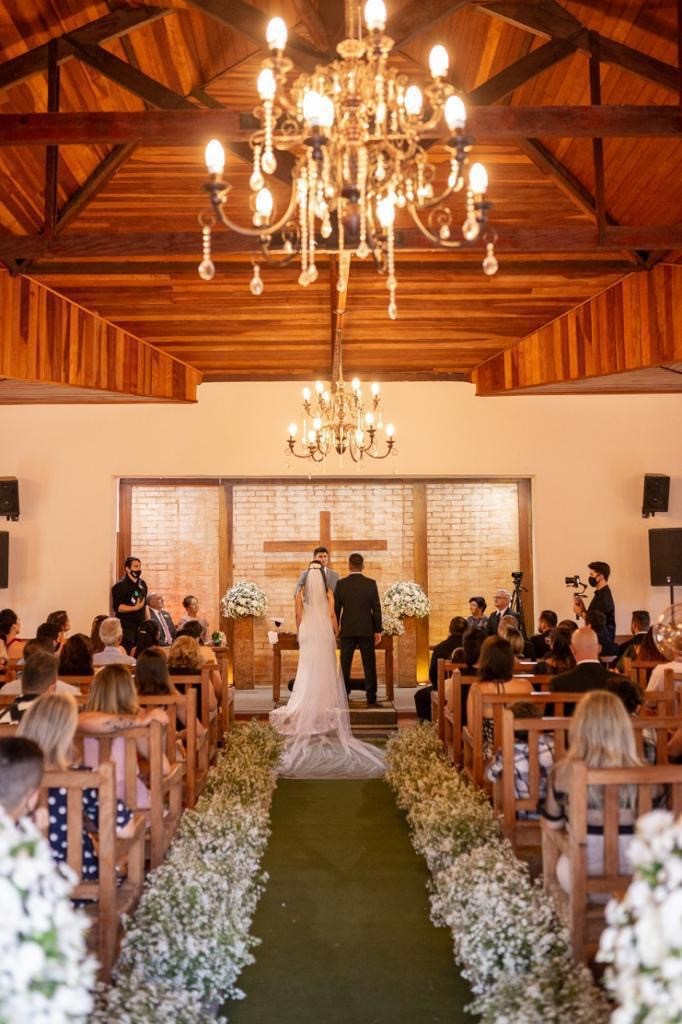 Cerimônia na capela estilo franciscano (150 sentados) ou ao ar livre, e recepção no salão — sem deslocamentos, sem estresse.