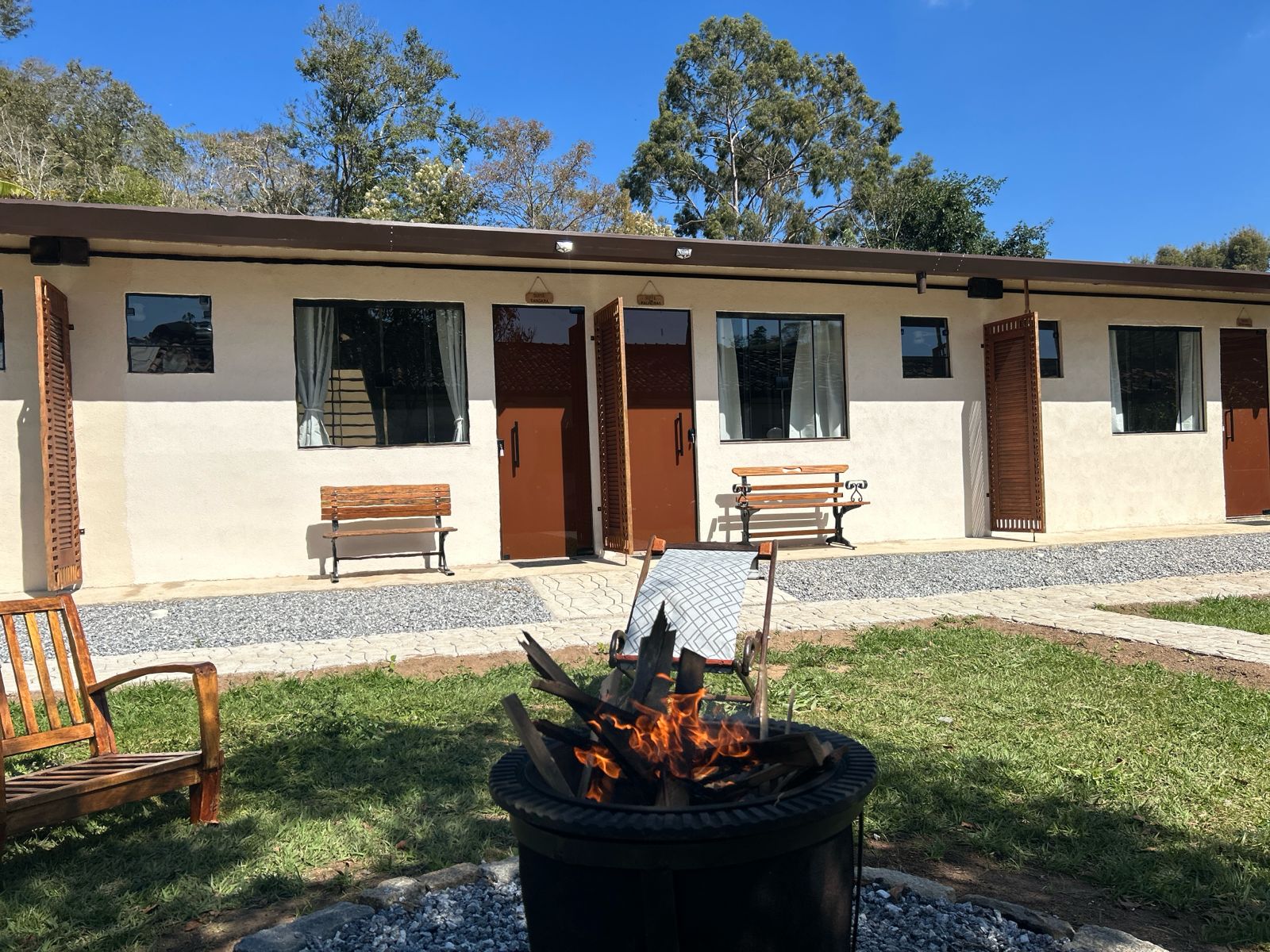 ventilação com ventiladores e áreas externas amplas (gramado, cascata iluminada, árvores centenárias, playground e piscinas).