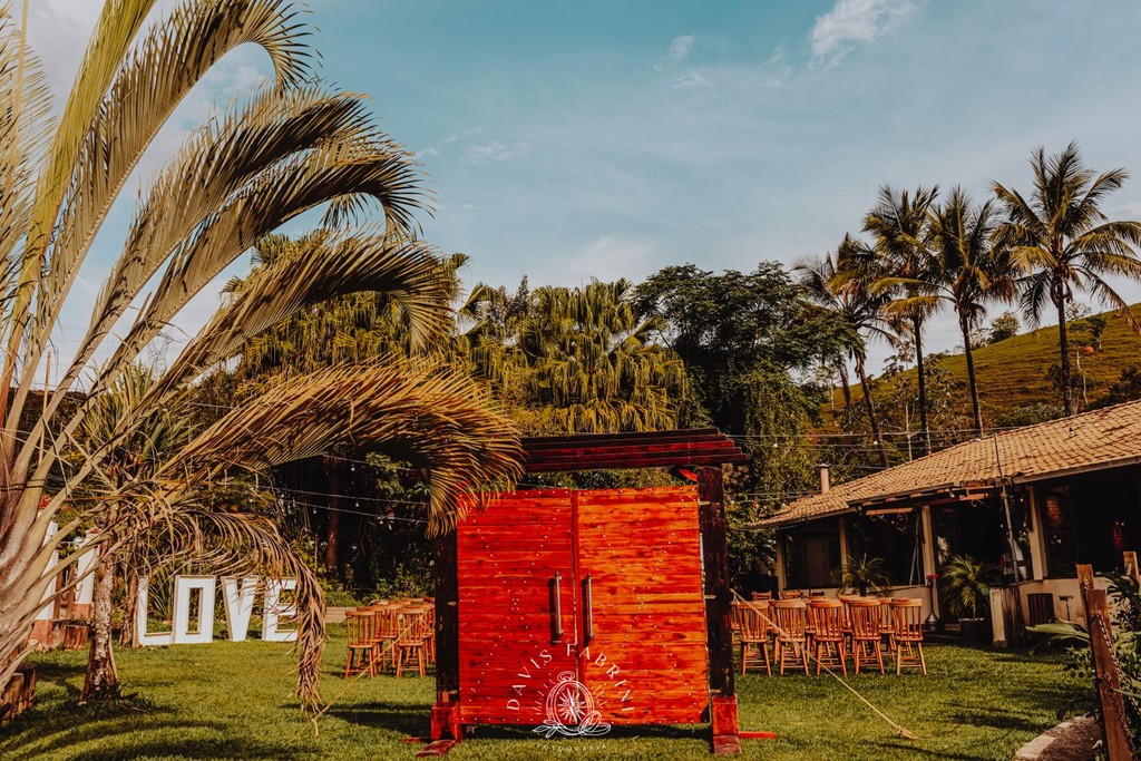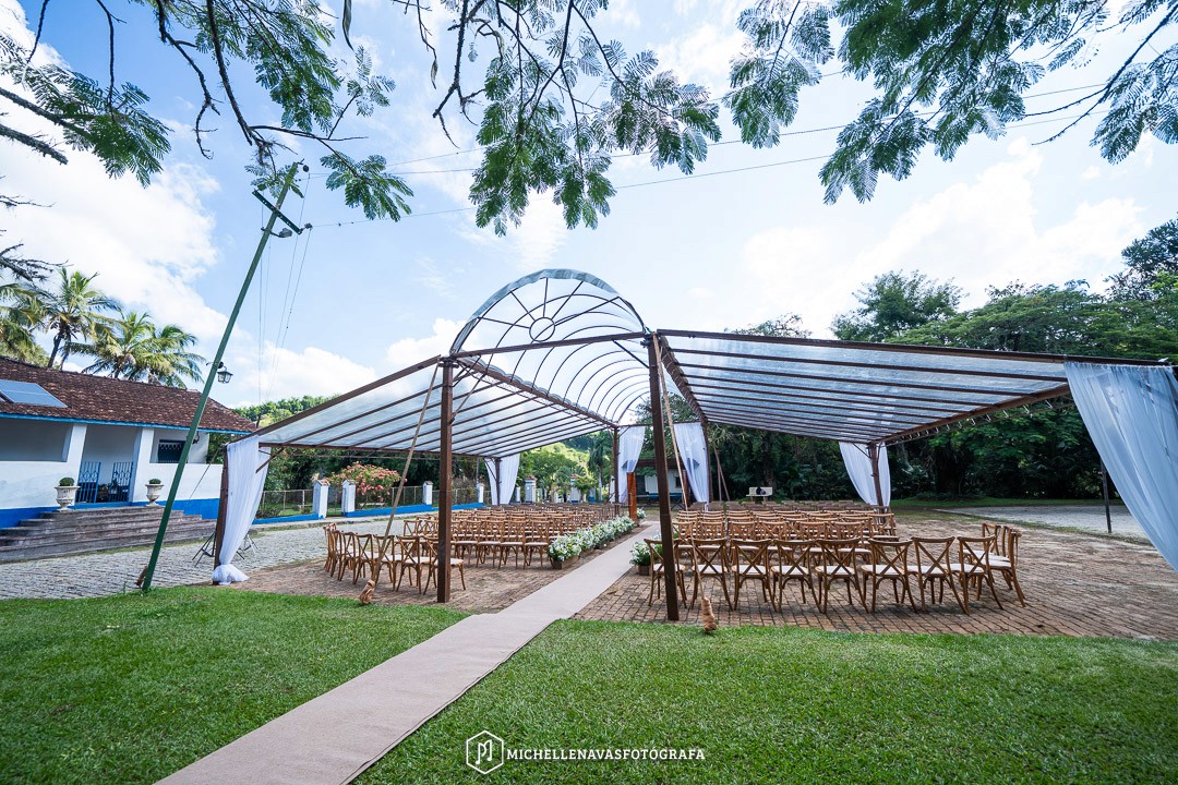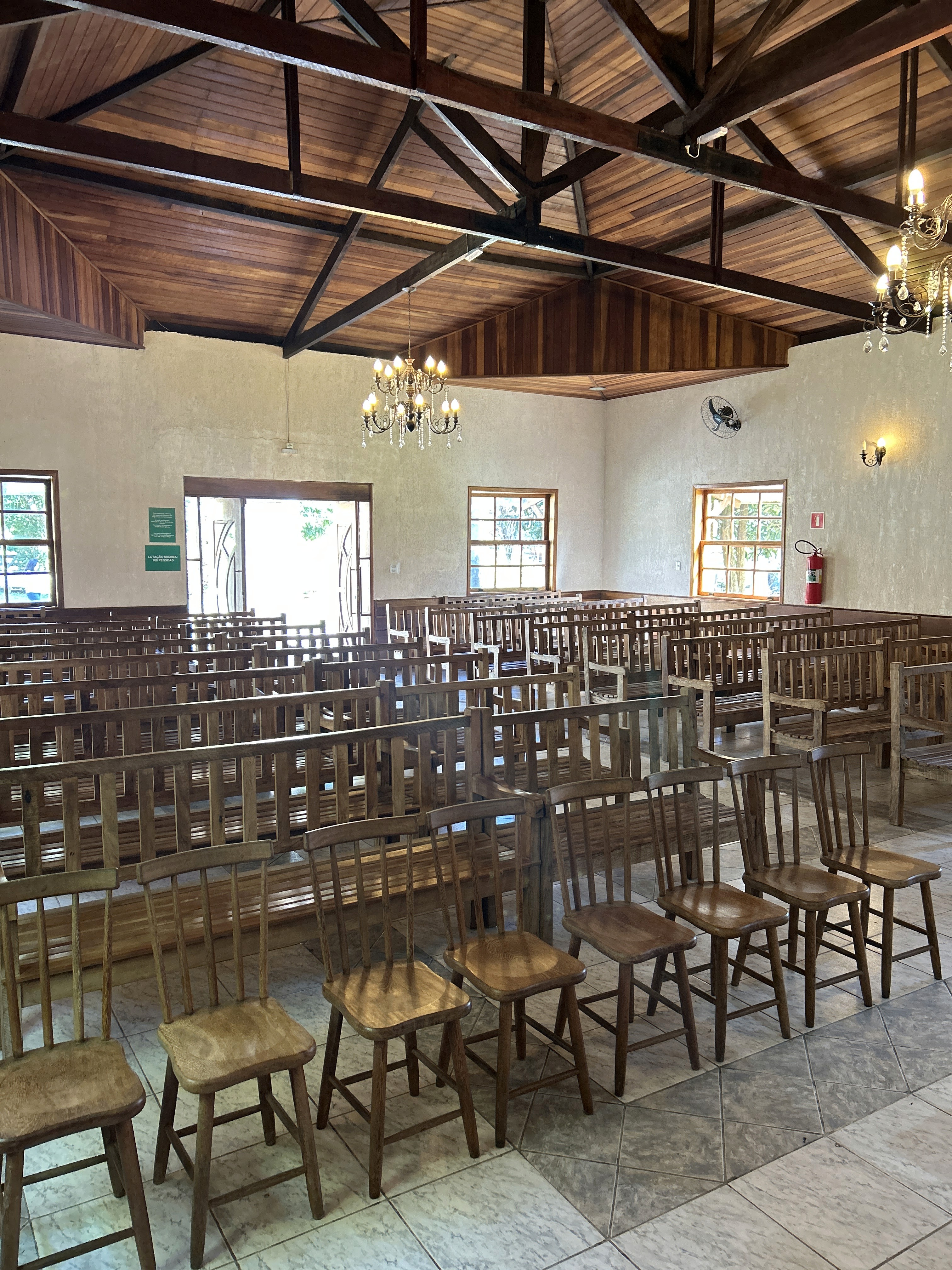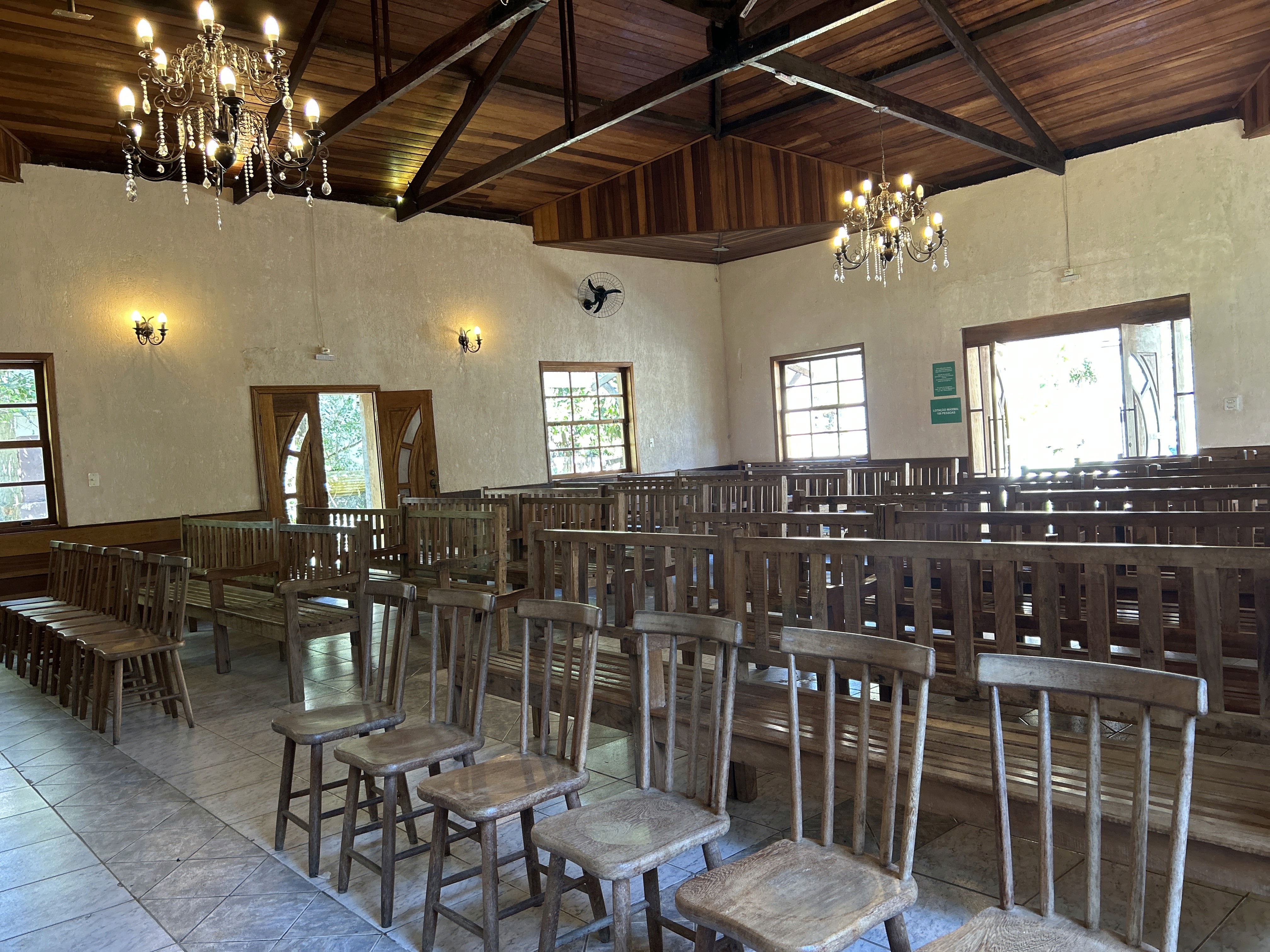 Sim. A fazenda tem capela e salões no mesmo complexo.