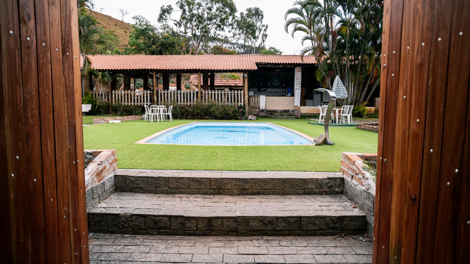 (piscina, salão, cozinha, quadra, parte dos animais)